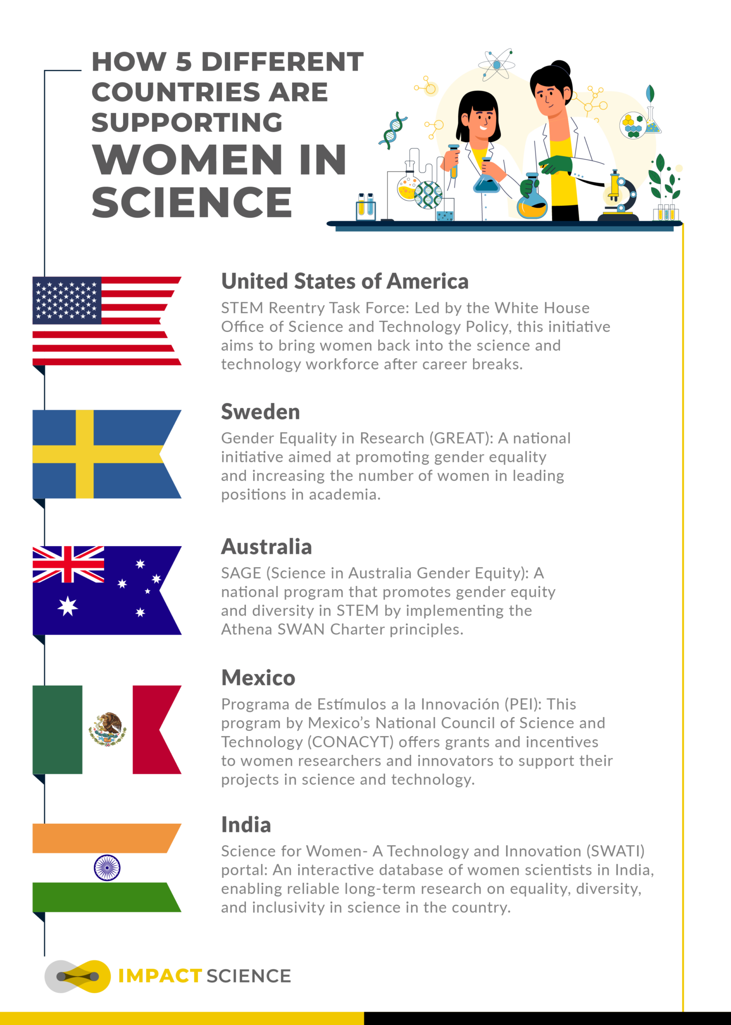 The below infographic delves into the approaches taken by five diverse nations: the United States, Sweden, Australia, Mexico, and India. Each country brings its unique blend of policies, initiatives, and cultural considerations to the table, showcasing a range of strategies aimed at fostering gender diversity and inclusivity in scientific disciplines. From increasing the number of women leaders to facilitating workforce reentry after career breaks, these nations are paving the way for greater female participation and leadership in the scientific community. By highlighting these efforts, this infographic aims to inspire continued collaboration and innovation on a global scale, driving towards a future where women in science thrive and excel.