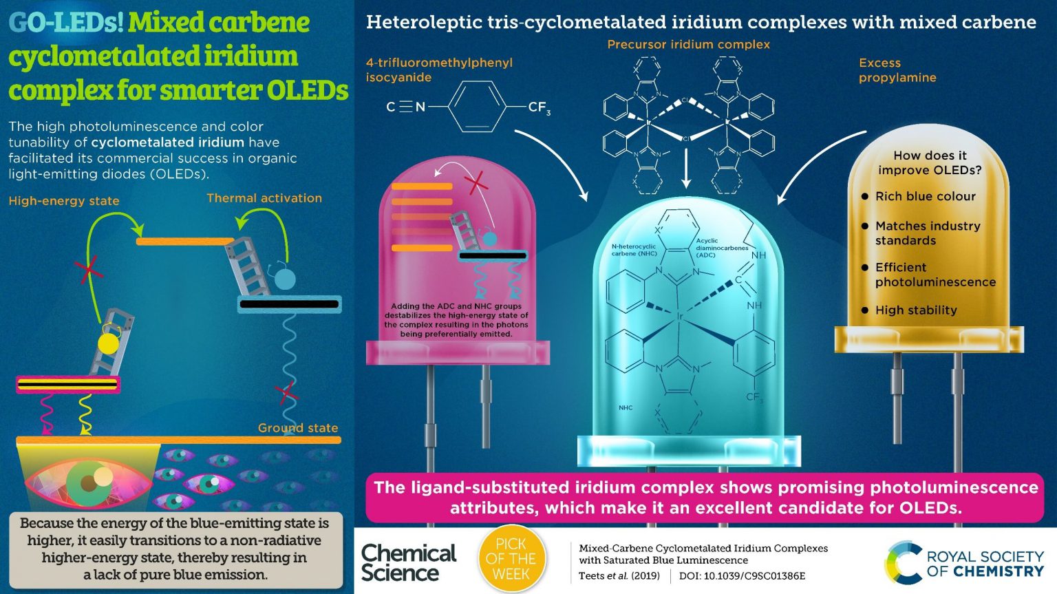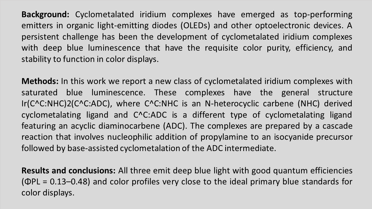 The following abstract from the Royal Society of Chemistry presents a textual explanation of the Mixed-carbene cyclometalated iridium complexes with saturated blue luminescence